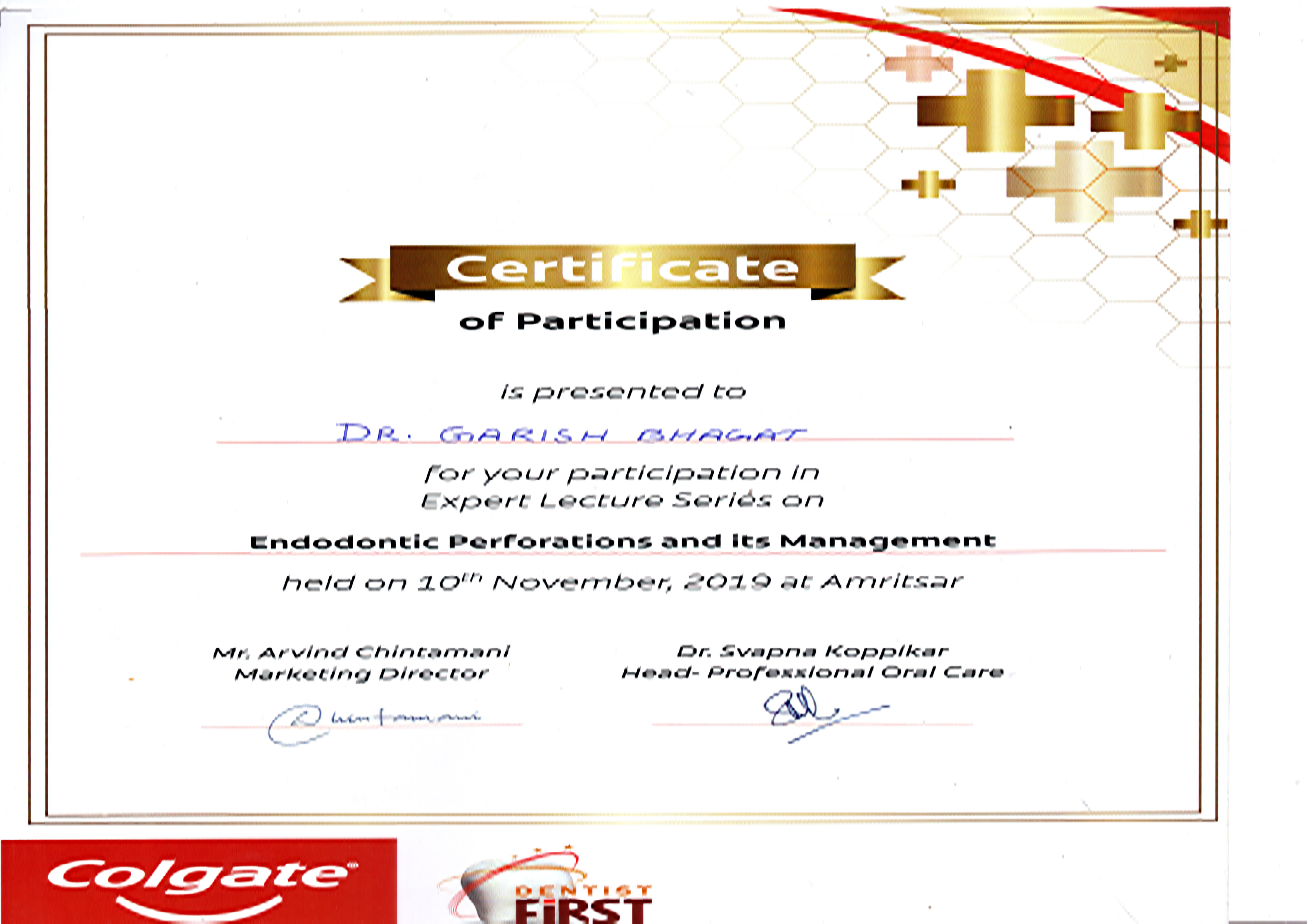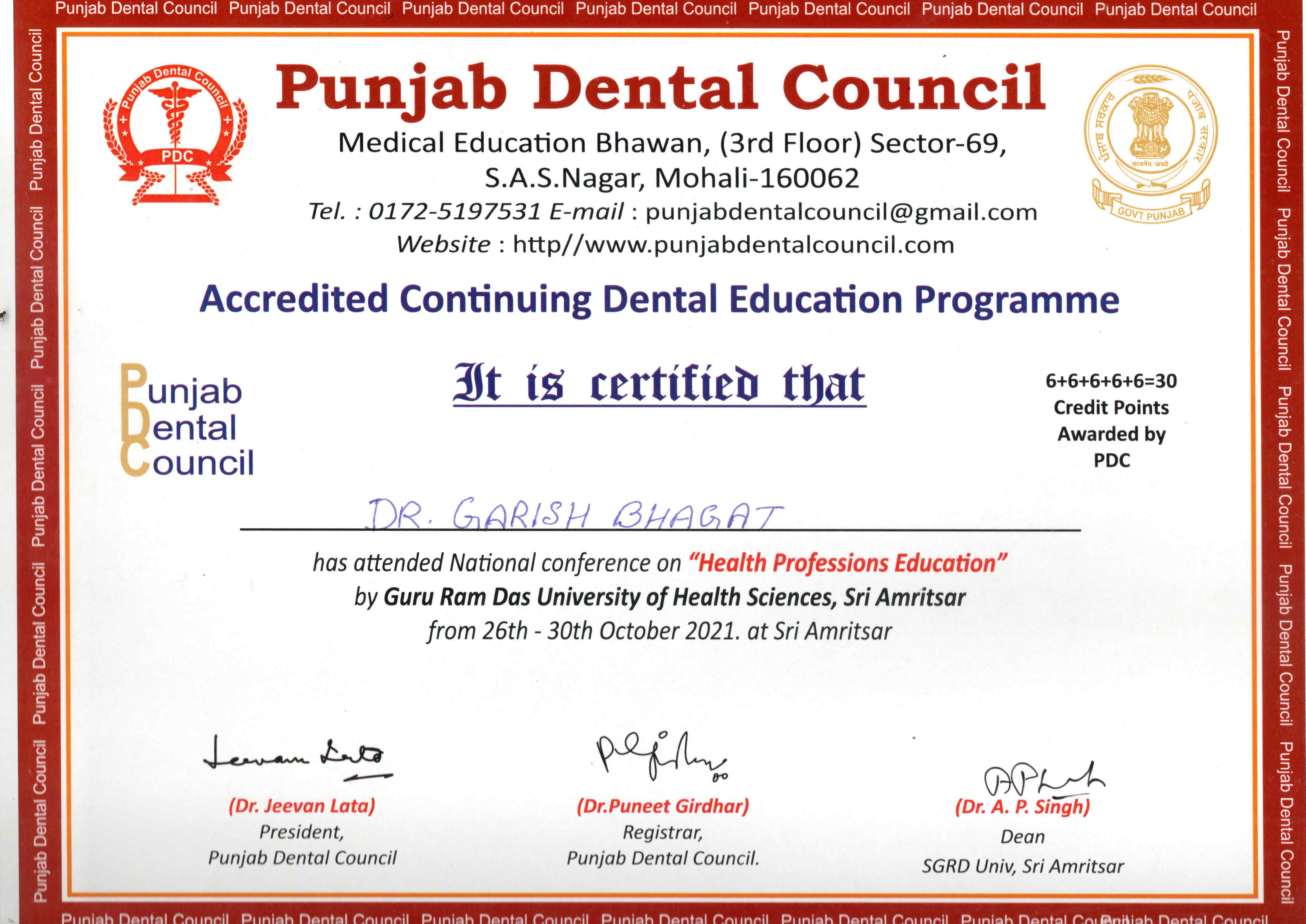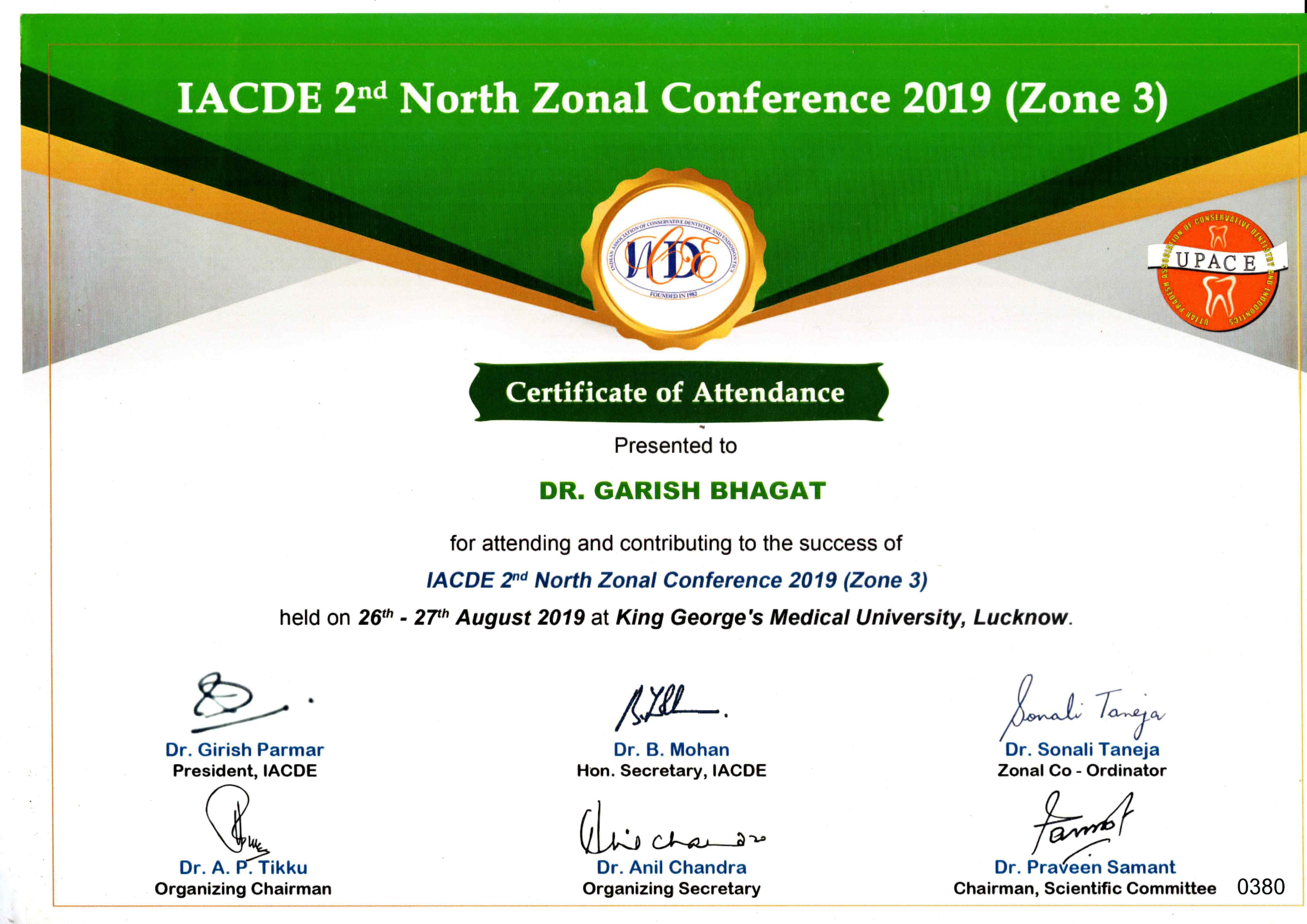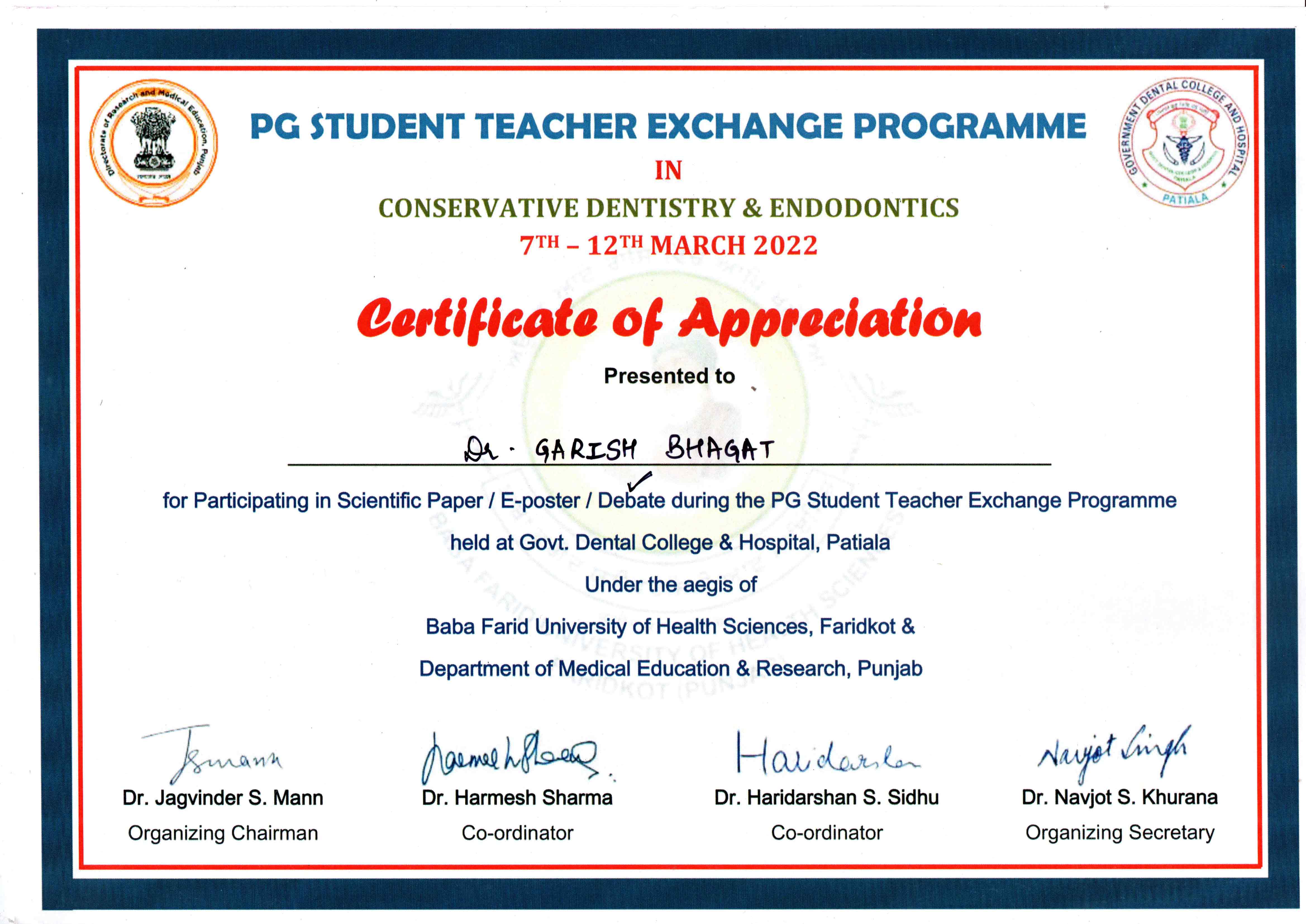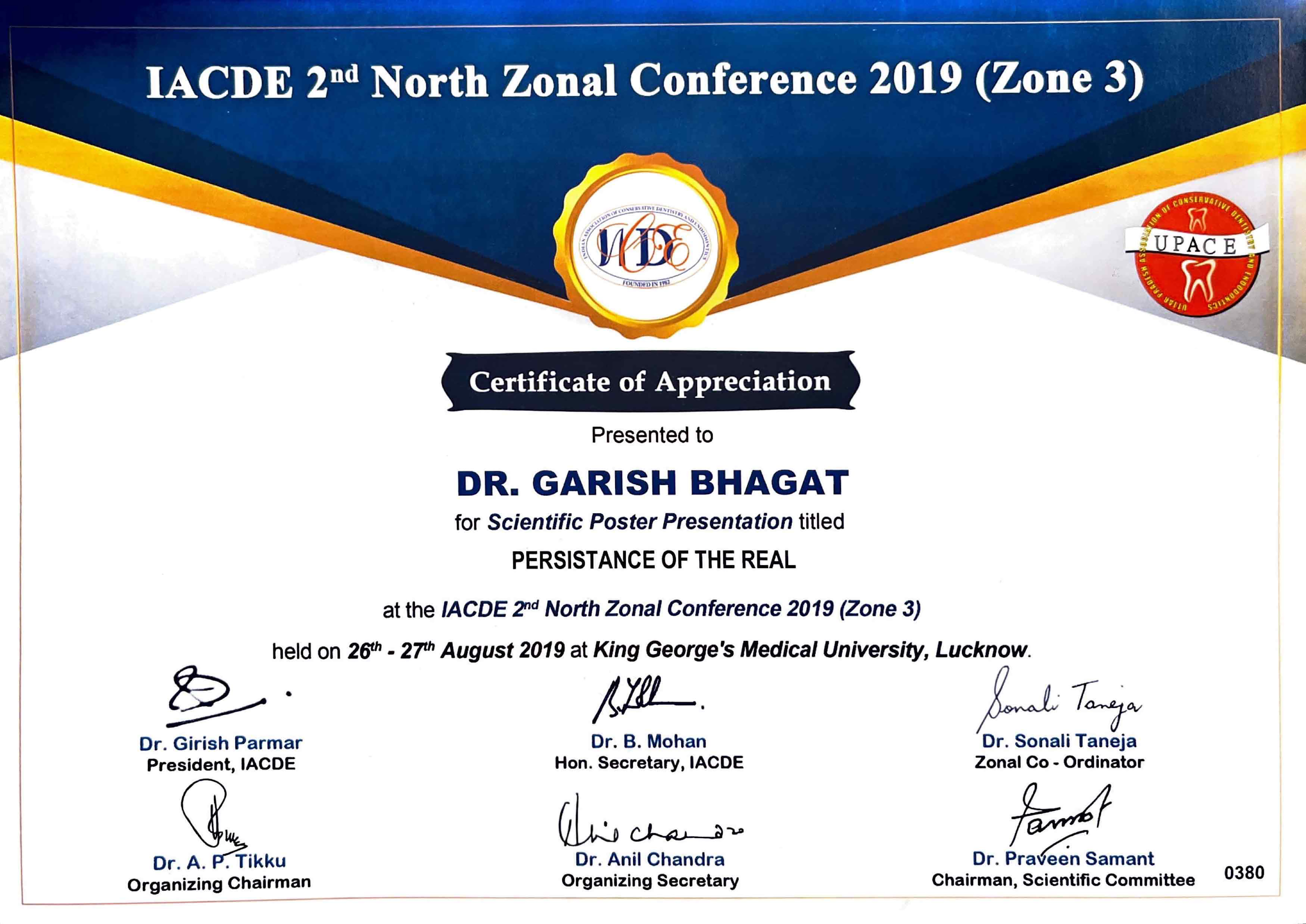 Due to his keen interest in academia, Dr. Garish has attended various state and national conferences and has presented papers and poster at IACDE 2nd North Zonal conference 2019, 12th IFEA Wor1d Endodontic Congress 2020 and 37th IACDE National Conference Bhopal and also several publications under his name